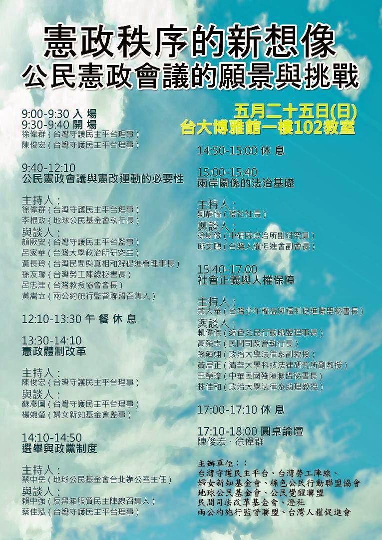 主辦單位:台灣守護民主平台、台灣勞工陣線、婦女新知基 金會、綠色公民行動聯盟協會、澄社、地球公民基金會、公 民覺醒聯盟、民間司法改革基金會、兩公約施行監督聯盟、 台灣人權促進會